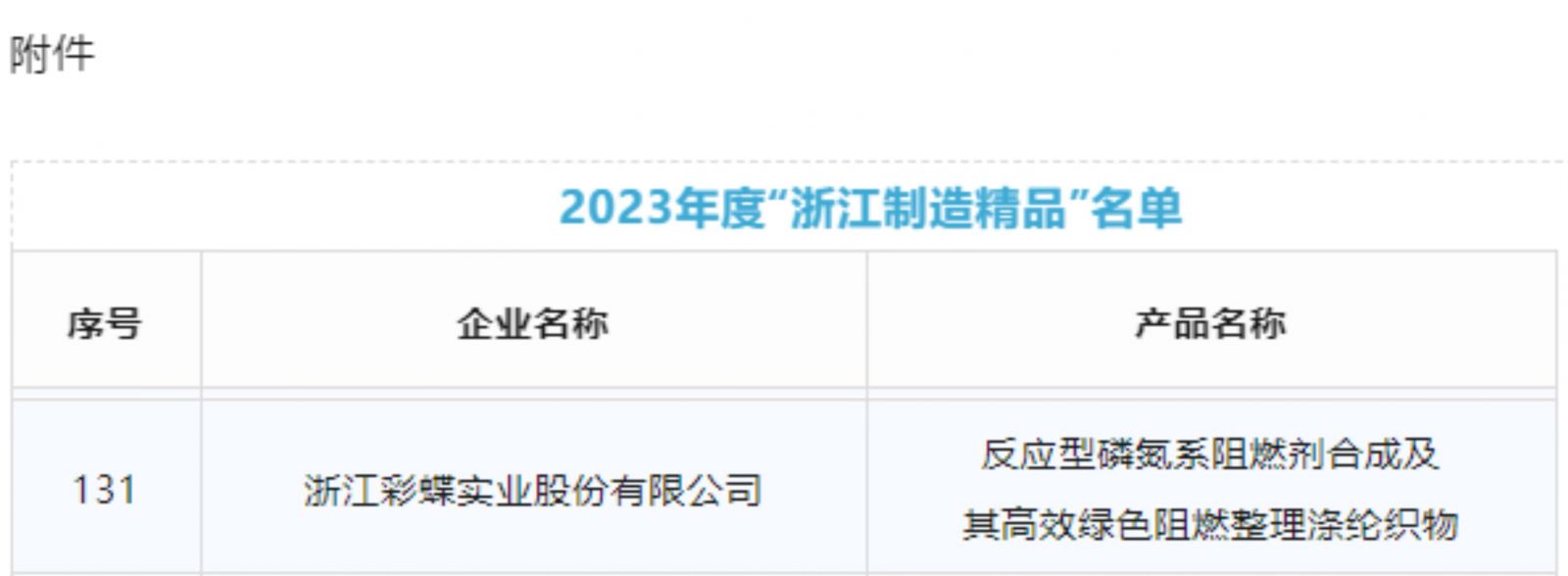近日,浙江省經(jīng)濟和信息化廳公布2023年度“浙江制造精品”名單,彩蝶實業(yè)研發(fā)產(chǎn)品”反應(yīng)型磷氮系阻燃劑合成及其高效綠